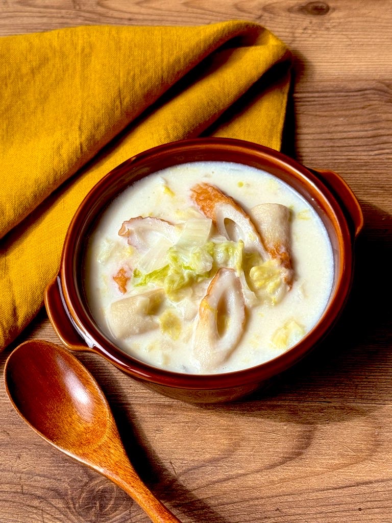ちくわチャウダー。白菜とちくわのクラムチャウダー風スープ。いるはずのないホタテやアサリの味がする!