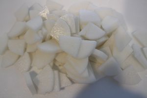 - 大根は皮をむき、厚さ5ミリ程度のイチョウ切りにする。
